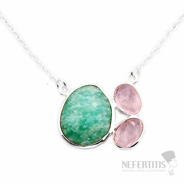 Einzigartige Silberkette mit geschliffenem Amazonit und Rosenquarz. Amazonit übertrifft mit seinem grün-blauen Farbton fast die Schönheit von natürlichem Türkis. Beim Anblick dieser Kette werden Sie träumen und irgendwo ans Meer versetzt werden, in eine Bucht mit türkisblauem und grünem Wasser, gebadet in der Sonne eines Sommertages. Ag 925. Sie kaufen das abgebildete Schmuckstück.