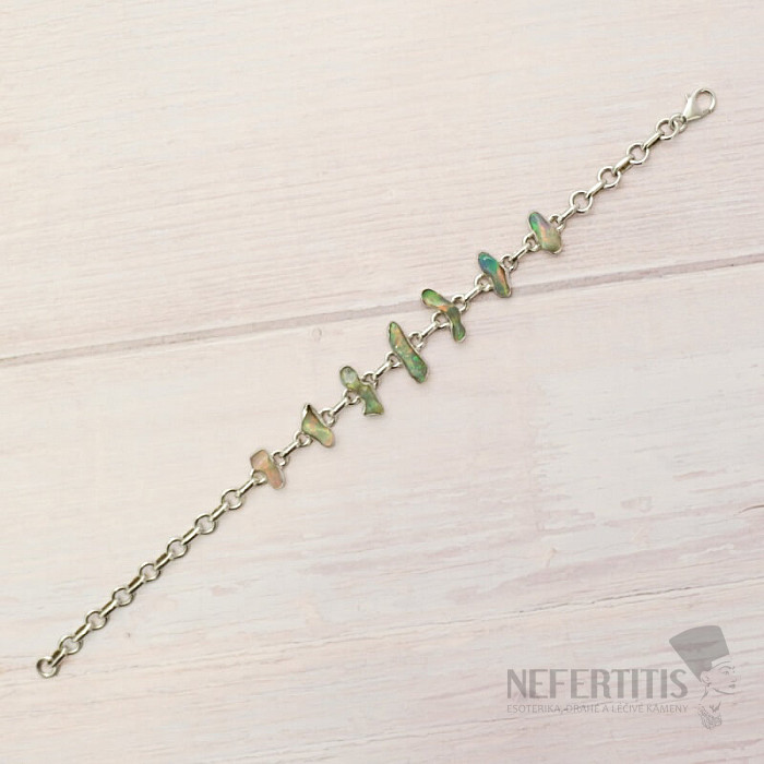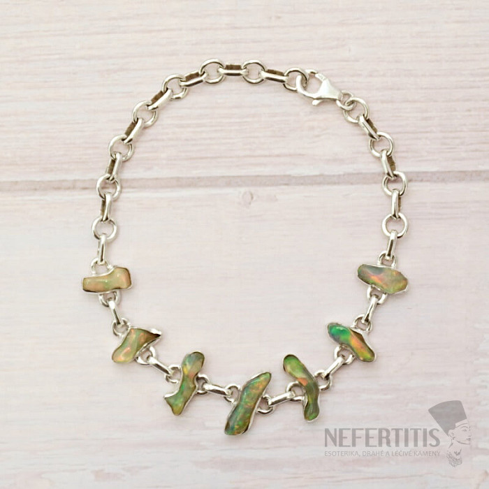 Ein wunderschönes und elegantes Armband aus rohem, poliertem Opal. Ein beeindruckendes und elegantes Schmuckstück, das auf den ersten Blick Freude und Gefühle der Harmonie hervorruft. Äthiopische Opale strotzen im Vergleich zu australischen Opalen förmlich vor neonhellen Farbreflexen. Auch wenn es auf den ersten Blick nicht so aussieht, wird das Farbfeuerwerk, das bei jeder Handbewegung aus den Opalen dieses Armbandes hervorbricht, nicht nur Sie, sondern auch Ihre gesamte Umgebung verzaubern. Äthiopische Opale haben unter verschiedenen Lichteinfall unterschiedliche Farben, sie sind sozusagen „Steinchamäleons“. Silber Ag 925. Sie kaufen das abgebildete Schmuckstück.