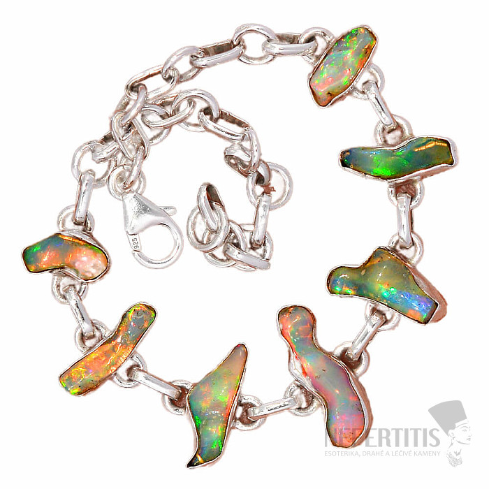 Ein wunderschönes und elegantes Armband aus rohem, poliertem Opal. Ein beeindruckendes und elegantes Schmuckstück, das auf den ersten Blick Freude und Gefühle der Harmonie hervorruft. Äthiopische Opale strotzen im Vergleich zu australischen Opalen förmlich vor neonhellen Farbreflexen. Auch wenn es auf den ersten Blick nicht so aussieht, wird das Farbfeuerwerk, das bei jeder Handbewegung aus den Opalen dieses Armbandes hervorbricht, nicht nur Sie, sondern auch Ihre gesamte Umgebung verzaubern. Äthiopische Opale haben unter verschiedenen Lichteinfall unterschiedliche Farben, sie sind sozusagen „Steinchamäleons“. Silber Ag 925. Sie kaufen das abgebildete Schmuckstück.