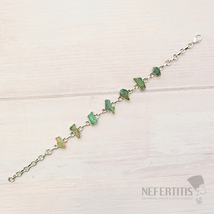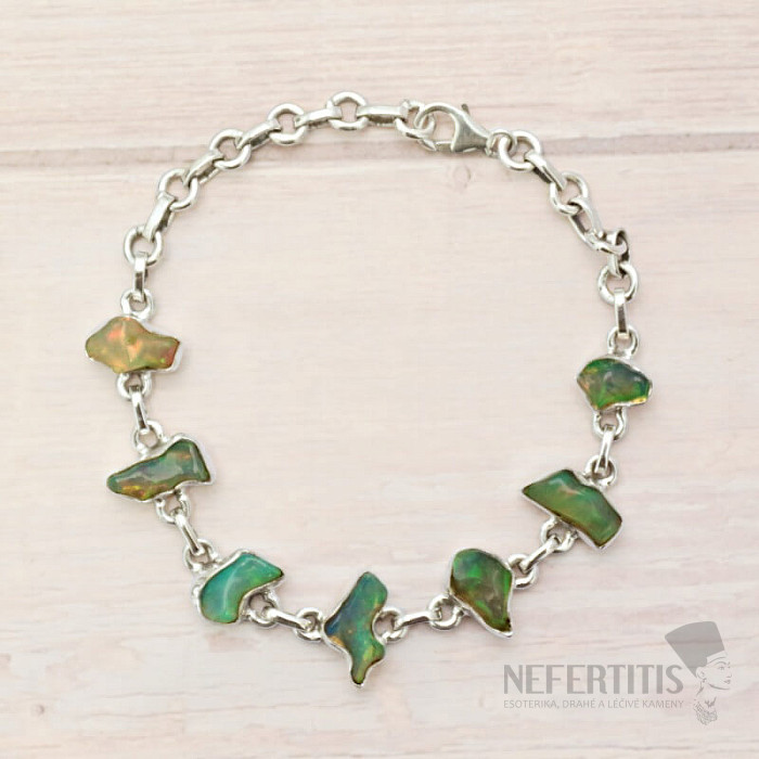 Ein wunderschönes und elegantes Armband aus rohem, poliertem Opal. Ein beeindruckendes und elegantes Schmuckstück, das auf den ersten Blick Freude und Gefühle der Harmonie hervorruft. Äthiopische Opale strotzen im Vergleich zu australischen Opalen förmlich vor neonhellen Farbreflexen. Auch wenn es auf den ersten Blick nicht so aussieht, wird das Farbfeuerwerk, das bei jeder Handbewegung aus den Opalen dieses Armbandes hervorbricht, nicht nur Sie, sondern auch Ihre gesamte Umgebung verzaubern. Äthiopische Opale haben unter verschiedenen Lichteinfall unterschiedliche Farben, sie sind sozusagen „Steinchamäleons“. Silber Ag 925. Sie kaufen das abgebildete Schmuckstück.