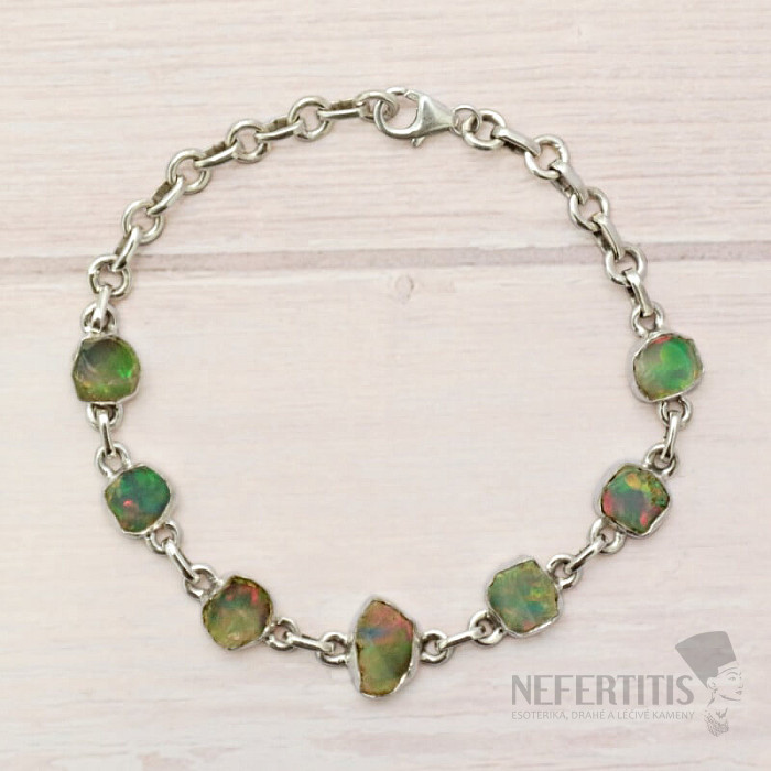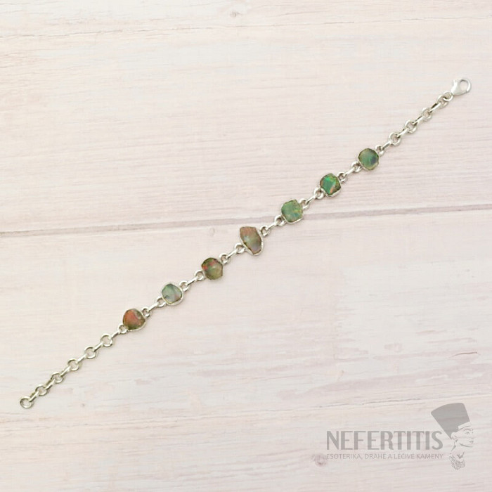 Ein wunderschönes und elegantes Armband aus rohem, poliertem Opal. Ein beeindruckendes und elegantes Schmuckstück, das auf den ersten Blick Freude und Gefühle der Harmonie hervorruft. Äthiopische Opale strotzen im Vergleich zu australischen Opalen förmlich vor neonhellen Farbreflexen. Auch wenn es auf den ersten Blick nicht so aussieht, wird das Farbfeuerwerk, das bei jeder Handbewegung aus den Opalen dieses Armbandes hervorbricht, nicht nur Sie, sondern auch Ihre gesamte Umgebung verzaubern. Äthiopische Opale haben unter verschiedenen Lichteinfall unterschiedliche Farben, sie sind sozusagen „Steinchamäleons“. Silber Ag 925. Sie kaufen das abgebildete Schmuckstück.