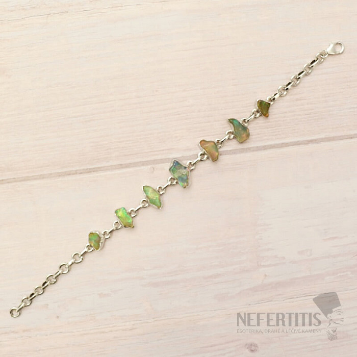 Ein wunderschönes und elegantes Armband aus rohem, poliertem Opal. Ein beeindruckendes und elegantes Schmuckstück, das auf den ersten Blick Freude und Gefühle der Harmonie hervorruft. Äthiopische Opale strotzen im Vergleich zu australischen Opalen förmlich vor neonhellen Farbreflexen. Auch wenn es auf den ersten Blick nicht so aussieht, wird das Farbfeuerwerk, das bei jeder Handbewegung aus den Opalen dieses Armbandes hervorbricht, nicht nur Sie, sondern auch Ihre gesamte Umgebung verzaubern. Äthiopische Opale haben unter verschiedenen Lichteinfall unterschiedliche Farben, sie sind sozusagen „Steinchamäleons“. Silber Ag 925. Sie kaufen das abgebildete Schmuckstück.