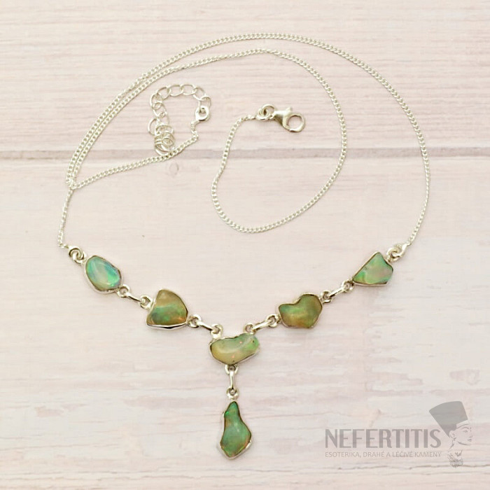 Moderne und elegante Silberkette aus rohem, poliertem Opal, mit wunderschönem Farbenspiel – Ag 925. Ein eindrucksvolles und elegantes Schmuckstück, dessen Anblick Freude und Gefühle der Harmonie hervorruft. Äthiopische Opale schwelgen im Vergleich zu australischen Opalen förmlich in neonhellen Farbreflexen. Auch wenn es auf den ersten Blick nicht so aussieht, wird das Farbfeuerwerk, das bei jedem Lichteinfall aus den Opalen dieser Kette hervorbricht, nicht nur Sie, sondern Ihre gesamte Umgebung verzaubern. Sie kaufen das abgebildete Schmuckstück.