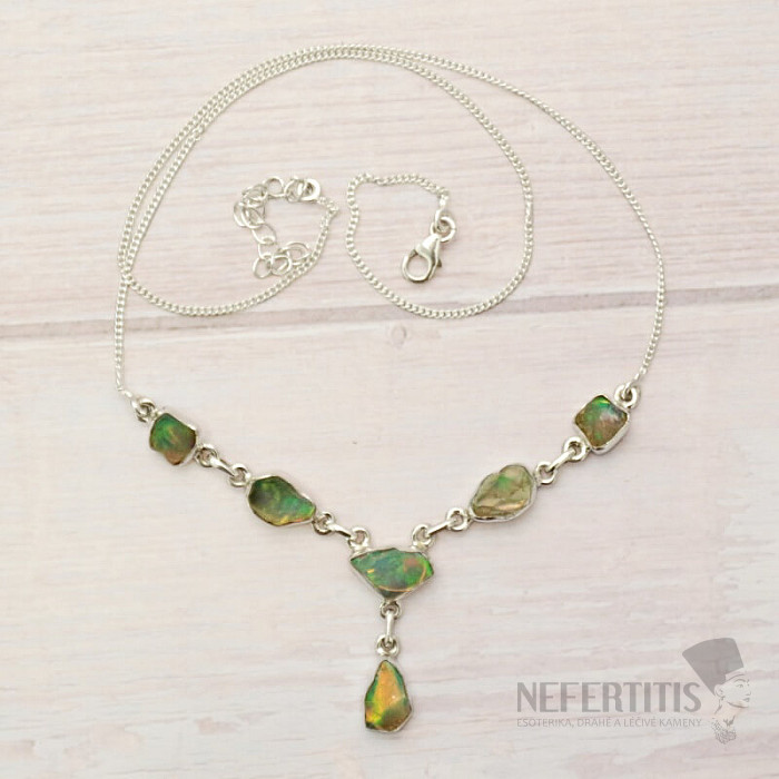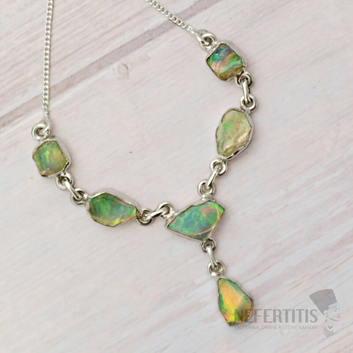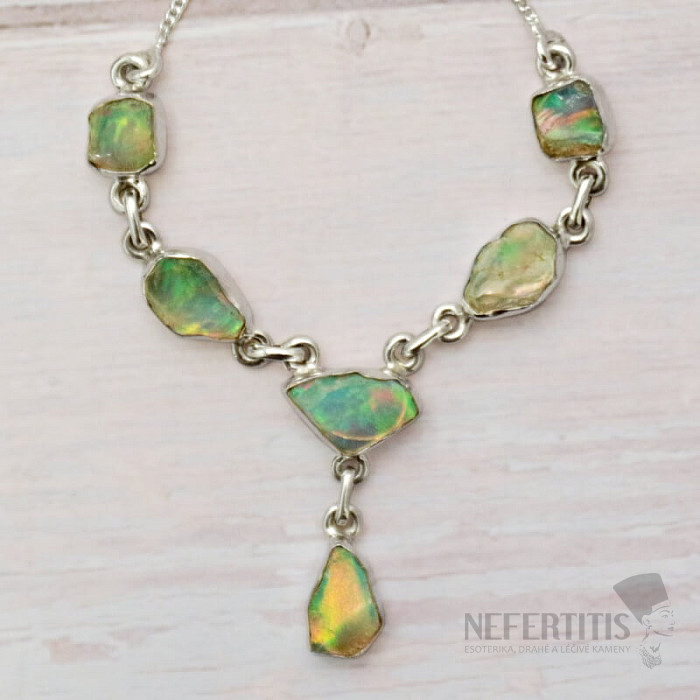 Moderne und elegante Silberkette aus rohem, poliertem Opal, mit wunderschönem Farbenspiel – Ag 925. Ein eindrucksvolles und elegantes Schmuckstück, dessen Anblick Freude und Gefühle der Harmonie hervorruft. Äthiopische Opale schwelgen im Vergleich zu australischen Opalen förmlich in neonhellen Farbreflexen. Auch wenn es auf den ersten Blick nicht so aussieht, wird das Farbfeuerwerk, das bei jedem Lichteinfall aus den Opalen dieser Kette hervorbricht, nicht nur Sie, sondern Ihre gesamte Umgebung verzaubern. Sie kaufen das abgebildete Schmuckstück.