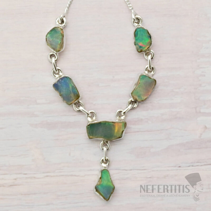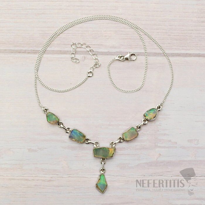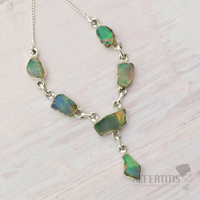 Moderne und elegante Silberkette aus rohem, poliertem Opal, mit wunderschönem Farbenspiel – Ag 925. Ein eindrucksvolles und elegantes Schmuckstück, dessen Anblick Freude und Gefühle der Harmonie hervorruft. Äthiopische Opale schwelgen im Vergleich zu australischen Opalen förmlich in neonhellen Farbreflexen. Auch wenn es auf den ersten Blick nicht so aussieht, wird das Farbfeuerwerk, das bei jedem Lichteinfall aus den Opalen dieser Kette hervorbricht, nicht nur Sie, sondern Ihre gesamte Umgebung verzaubern. Sie kaufen das abgebildete Schmuckstück.