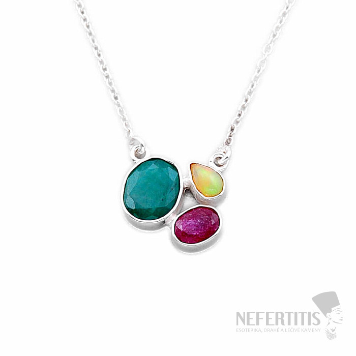 Silberkette mit indischem Smaragd, indischem Rubin und äthiopischem Opal. Ag 925.