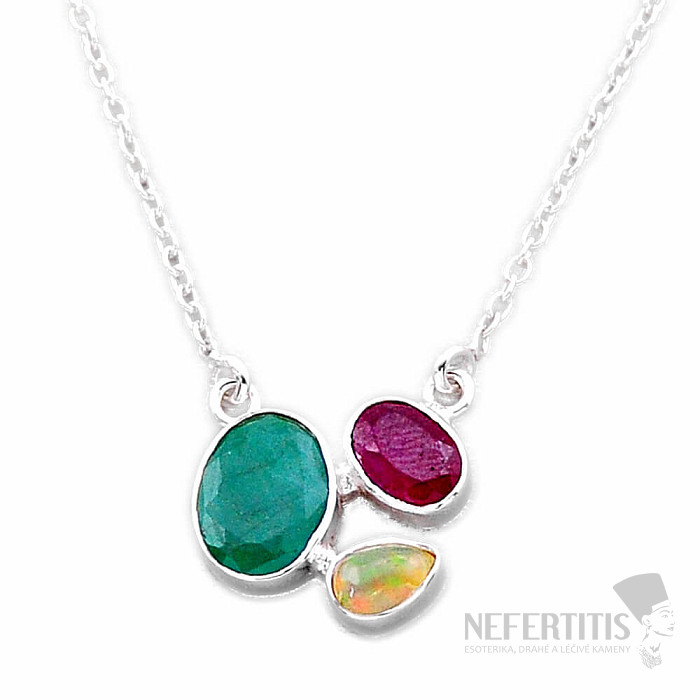 Silberkette mit indischem Smaragd, indischem Rubin und äthiopischem Opal. Ag 925.