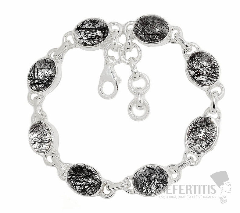 Silbernes Kristallarmband mit reichhaltigen Einschlüssen von schwarzem Turmalin - Skoryl. Ag 925. Die ungewöhnliche Optik des Steins durch Einschlüsse, die an dünne Linien erinnern, wird zu einem Designerschmuckstück vereint. Sie erwerben direkt das abgebildete Schmuckstück.