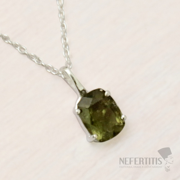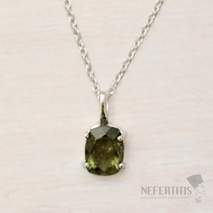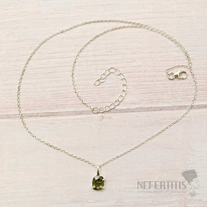 Attraktive Silberkette mit geschliffenem Moldavit. Ag 925. Sie erwerben das abgebildete Schmuckstück.