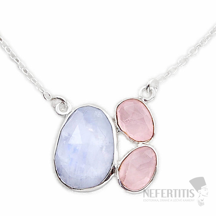 Silberkette mit geschliffenem Mondstein und Rosenquarz. Ag 925. Sie kaufen direkt den abgebildeten Schmuck.