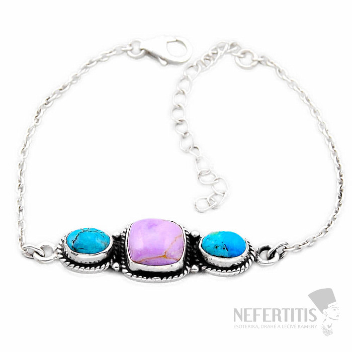 Ein schönes Silberarmband mit Phosphosiderit und Türkis. Ag 925. Phosphosiderit ist ein Talisman, der den Wunsch unterstützt, einen Weg zu finden, einen Teil des Lebens in einen gewünschten Zustand zu verwandeln. Lila ist die Farbe der Intuition, der Träume und des Luxus. Der wunderschön gefärbte Stein wird eine Dekoration für verschiedene Anlässe sein. Sie erwerben das abgebildete Schmuckstück.