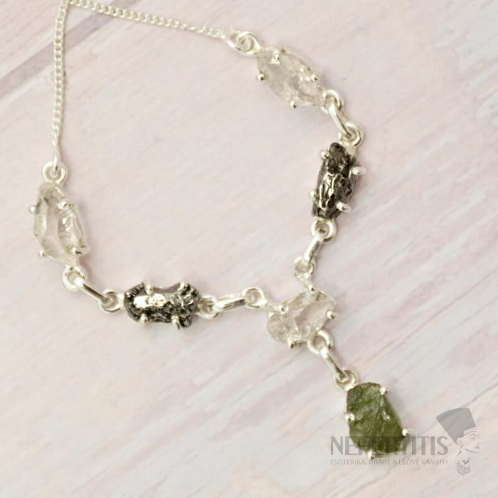Attraktive Silberkette mit Moldaviten, Herkimer-Diamanten und Campo del Cielo-Meteoriten. Ag 925. Sie erwerben das abgebildete Schmuckstück.