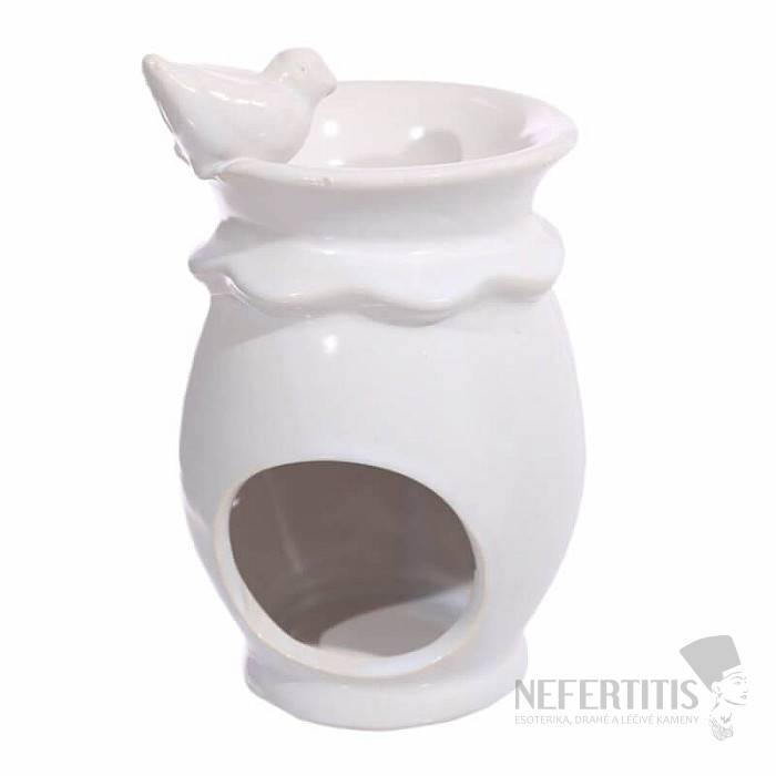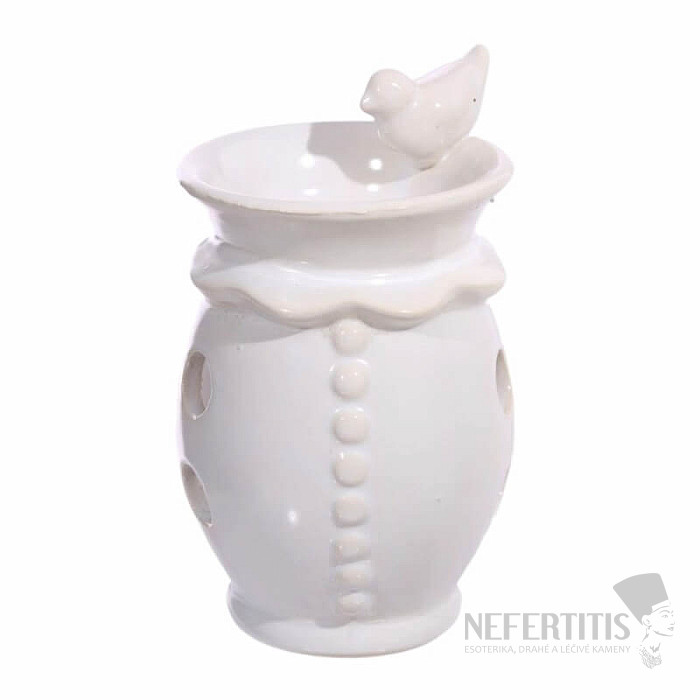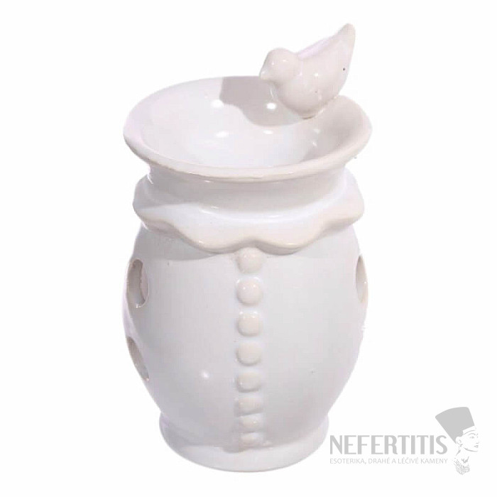 Die Duftlampe „Weißer Vogel“ aus Keramik besticht durch das filigrane Detail eines kleinen Vogels, der am Rand der oberen Wasserschale sitzt. Dieses kleine Element verleiht der Lampe Verspieltheit, Leichtigkeit und ein Gefühl der Verbundenheit mit der Natur.