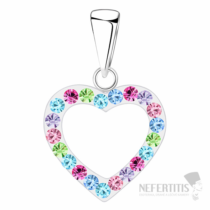 Die herzförmige Kontur ist mit farbenfrohen, geschliffenen Kristallen besetzt, die ein verspieltes Farbenspiel erzeugen und das Licht wunderschön reflektieren. Dadurch wirkt der Anhänger gleichzeitig frisch, jugendlich und elegant.