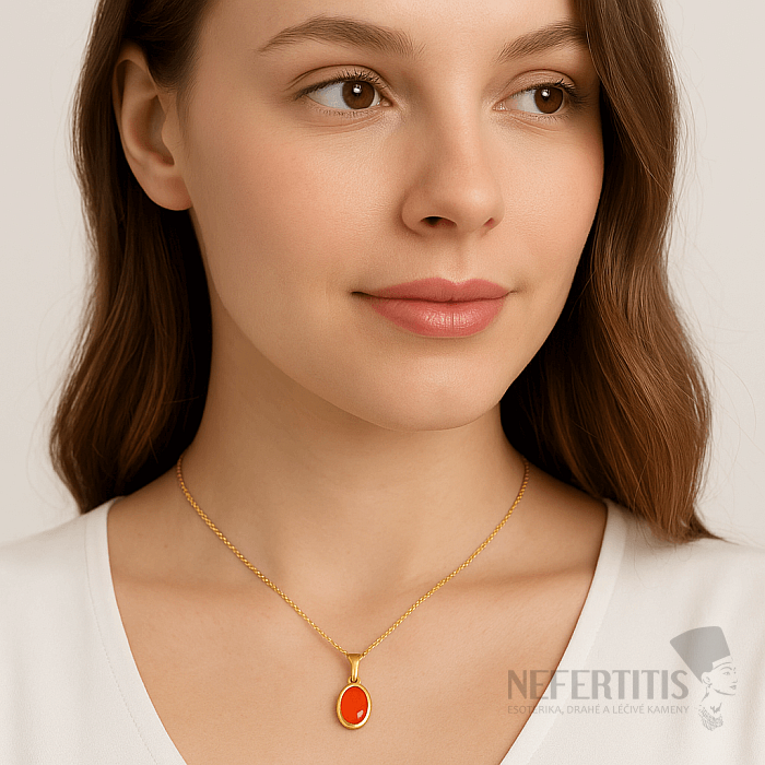 Das markanteste Merkmal dieses Schmuckstücks ist ein 8 mm großer, natürlich geschliffener Karneol , der in einer präzise gearbeiteten, vergoldeten Fassung eingefasst ist, welche seine satte orange-rote Farbe besonders zur Geltung bringt. Der Anhänger wiegt nur 0,5 g und ist daher sehr leicht, angenehm zu tragen und perfekt für jeden Tag geeignet.
