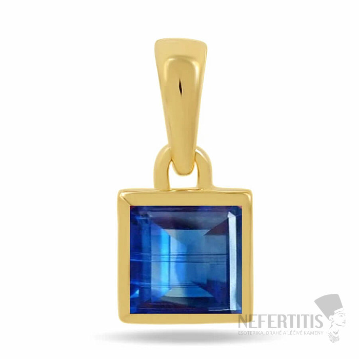 Dieser zarte Anhänger aus 925er Sterlingsilber mit langlebiger 14-Karat-Vergoldung besticht durch sein modernes und minimalistisches Design. Im Zentrum des Schmuckstücks befindet sich ein natürlicher blauer Kyanit von ca. 6 mm Größe, der in einer klaren geometrischen Linie gefasst ist. Der quadratische Stein ist präzise facettiert , wodurch er zusammen mit der natürlichen Maserung des Kyanits eine besondere optische Tiefe erhält. Mit einem Gewicht von nur ca. 0,6 g ist der Anhänger sehr leicht und angenehm zu tragen.