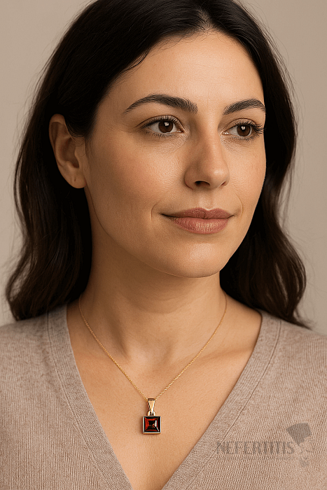 Dieser zarte Anhänger aus der Concetta-Kollektion ist aus 925er Sterlingsilber gefertigt und mit einer edlen 14-Karat- Vergoldung überzogen, die ihm einen luxuriösen und dauerhaft warmen Farbton verleiht. Das Herzstück des Schmuckstücks ist ein natürlicher Granat von ca. 6 mm Durchmesser, der in eine elegante quadratische Form geschliffen und präzise facettiert wurde, wodurch seine intensive rubinrote Farbe besonders gut zur Geltung kommt.