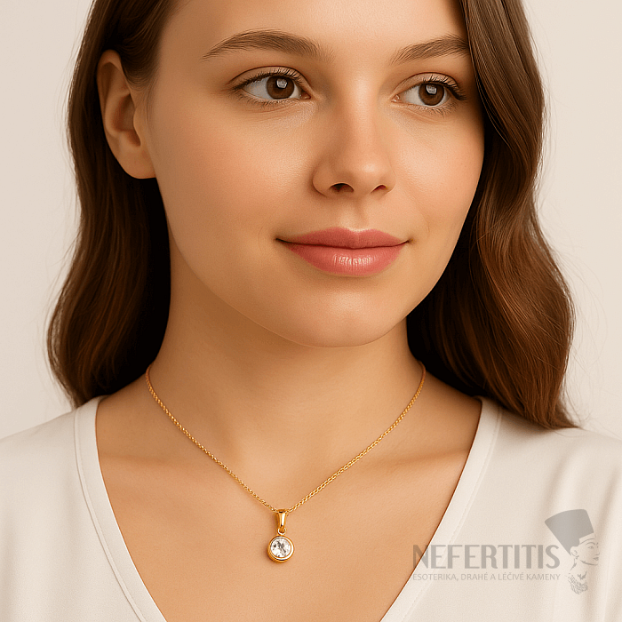 Das Zentrum des Anhängers bildet ein natürlich geschliffener, weißer Topas von ca. 5 mm Durchmesser, der sich durch Reinheit, hohen Glanz und brillantes Funkeln auszeichnet. Dank des präzisen Schliffs reflektiert er das Licht wunderschön und wirkt äußerst edel.