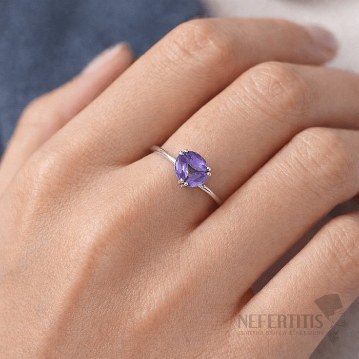 Der Ring ist mit drei natürlichen Amethysten von jeweils etwa 5 mm Durchmesser besetzt. Die Steine sind oval (Marquise-/Ovalschliff) und präzise facettiert , was ihr Funkeln und ihre Farbtiefe besonders zur Geltung bringt.