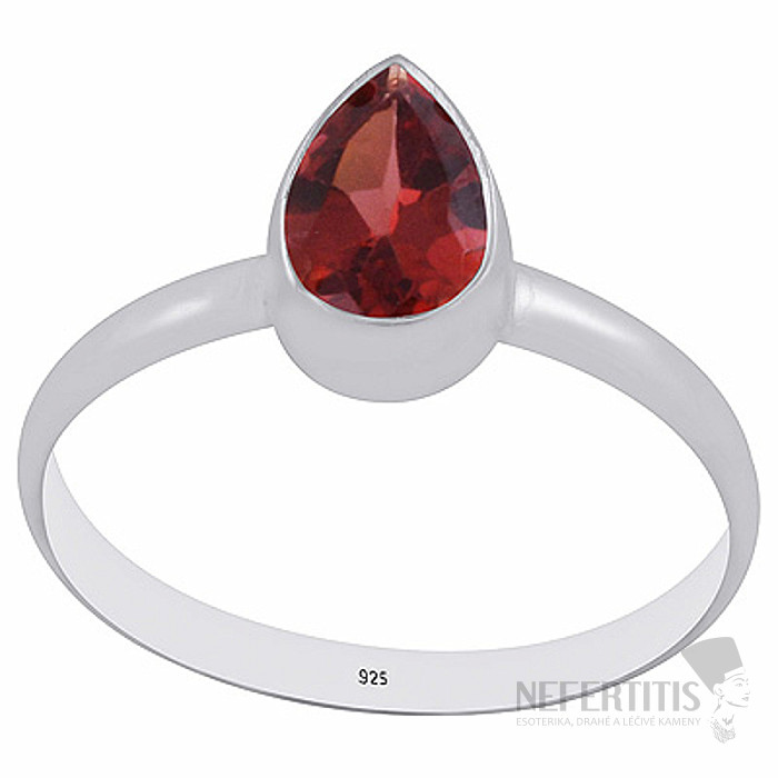 Das dominierende Merkmal des Rings ist ein natürlicher Granat von etwa 8 mm Durchmesser, der in eine glatte Fassung eingefasst und in Birnenform mit einem präzisen Facettenschliff geschliffen ist, was sein Funkeln und seine Farbtiefe maximiert.