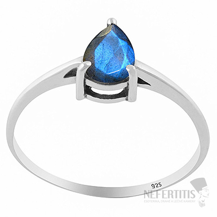 Das dominierende Merkmal des Rings ist ein natürlicher Labradorit von etwa 7 mm Durchmesser, der in eine Birnenform geschliffen und präzise facettiert wurde, wodurch sein charakteristischer optischer Effekt – die sogenannte Labradoreszenz – hervorgehoben wird.
