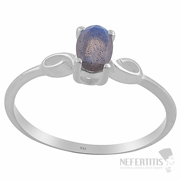 Das dominierende Merkmal des Rings ist der natürliche Labradorit, etwa 6 mm groß, in eine ovale Form mit einem glatten Cabochon-Schliff geschliffen, der seinen typischen optischen Effekt - die Labradoreszenz - voll zur Geltung bringt.