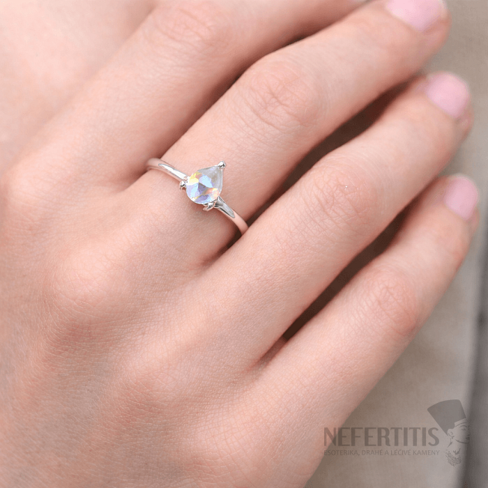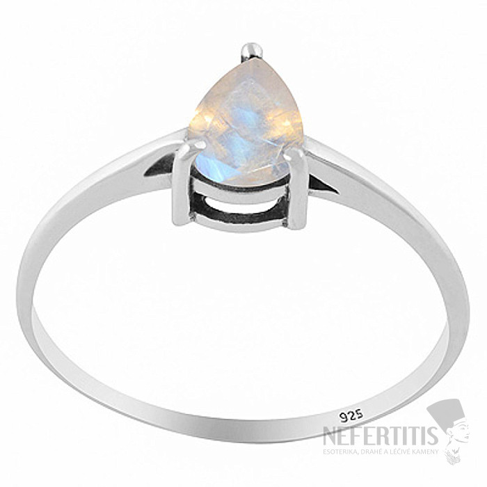 Das dominierende Merkmal des Rings ist ein natürlicher Mondstein von etwa 7 mm Größe, der in Birnenform mit einem präzisen Facettenschliff geschliffen ist, wodurch sein typischer optischer Effekt – ein subtiles Regenbogenleuchten (Adulareszenz) – hervorgehoben wird.
