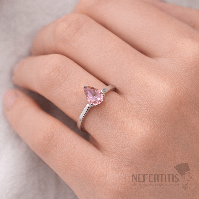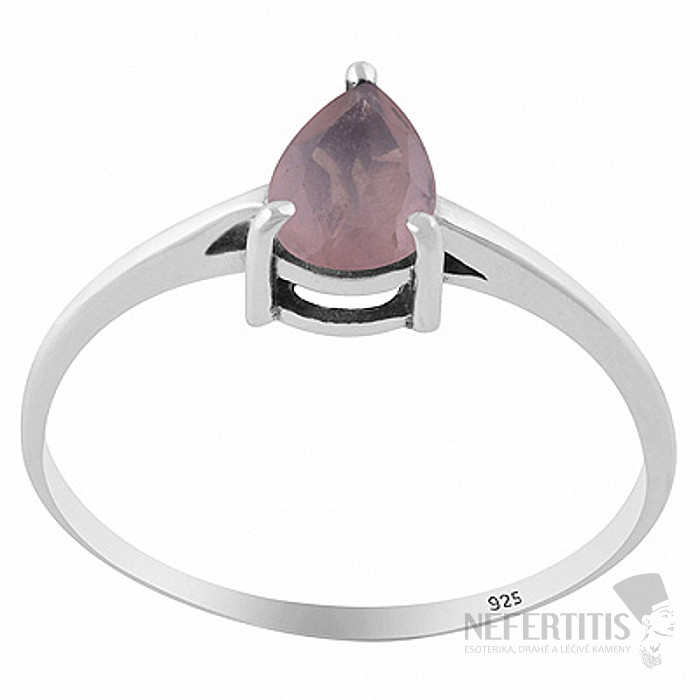 Das dominierende Merkmal des Rings ist ein natürlicher Rosenquarz von etwa 7 mm Durchmesser, der in Birnenform mit einem präzisen Facettenschliff geschliffen ist, was dem Stein ein subtiles Schimmern verleiht und seine zarte Farbe hervorhebt.