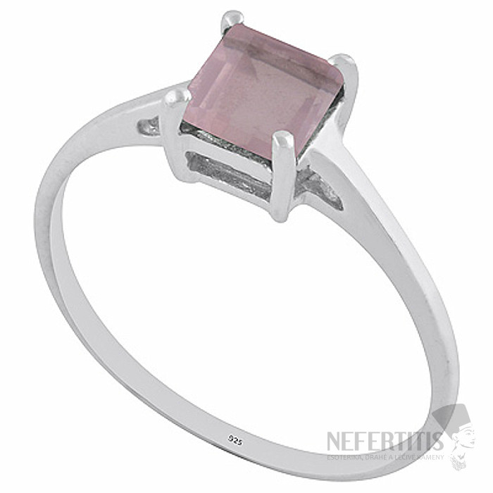 Das dominierende Merkmal des Rings ist ein natürlicher Rosenquarz von etwa 5 mm Größe, der in eine quadratische Form mit einem präzisen Facettenschliff geschliffen wurde, was dem Stein einen subtilen Glanz verleiht und seine natürliche Farbe hervorhebt.