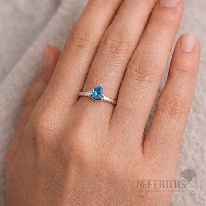 Das dominierende Merkmal des Rings ist ein Schweizer Blautopas von etwa 6 mm Durchmesser, der in Birnenform geschliffen ist und dessen präziser Facettenschliff sein Funkeln und seine Leuchtkraft maximiert.