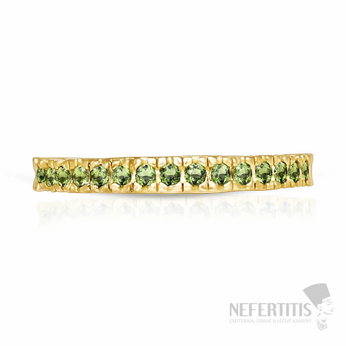 Der Ring ist mit einer Reihe natürlich geschliffener Moldavite verziert, die in einer Halb-Ewigkeits -Anordnung gefasst sind.