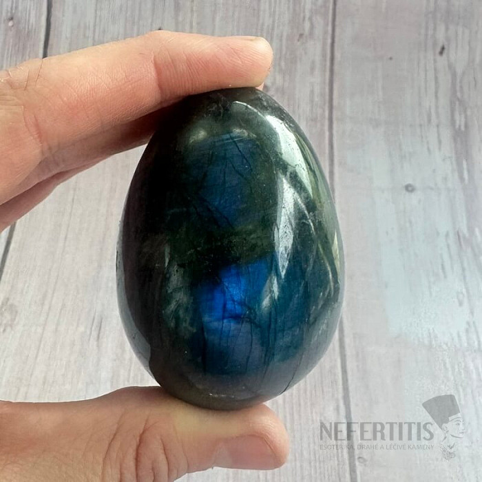 Ein wunderschönes Ei aus Labradorit geschnitten. Größe ca. 5,1 x 6,4 cm (Breite x Höhe), 237 g.