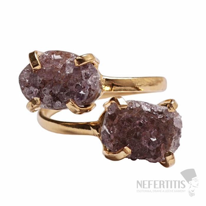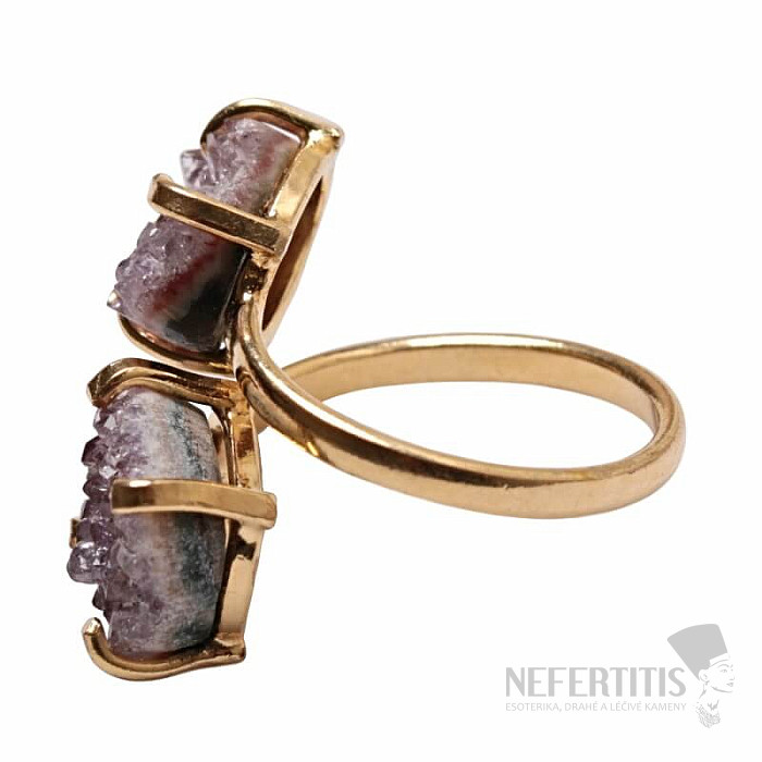 Entdecken Sie den Charme sanfter Eleganz mit diesem vergoldeten Ring, der von zwei Amethyst-Drusen dominiert wird. Jeder Stein ist ein Unikat. Der Ring ist eine Hommage an weibliche Schönheit und Individualität. Amethyst ist ein Stein der Leidenschaft, Liebe und des Verständnisses. Material: Naturstein, vergoldetes Messing. Sie erwerben den abgebildeten Ring.