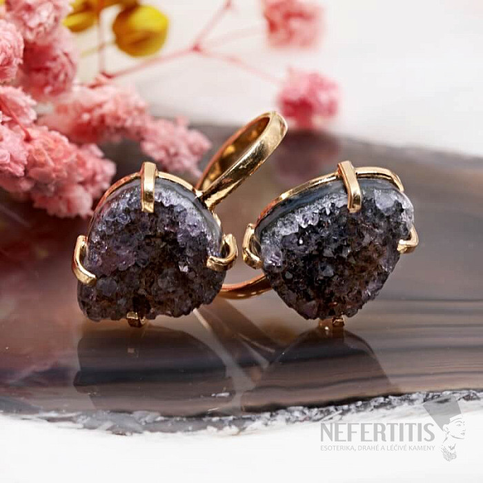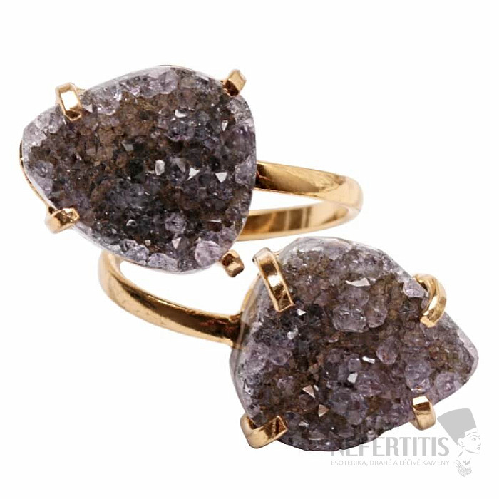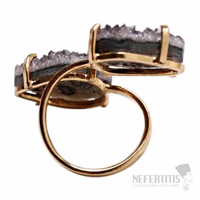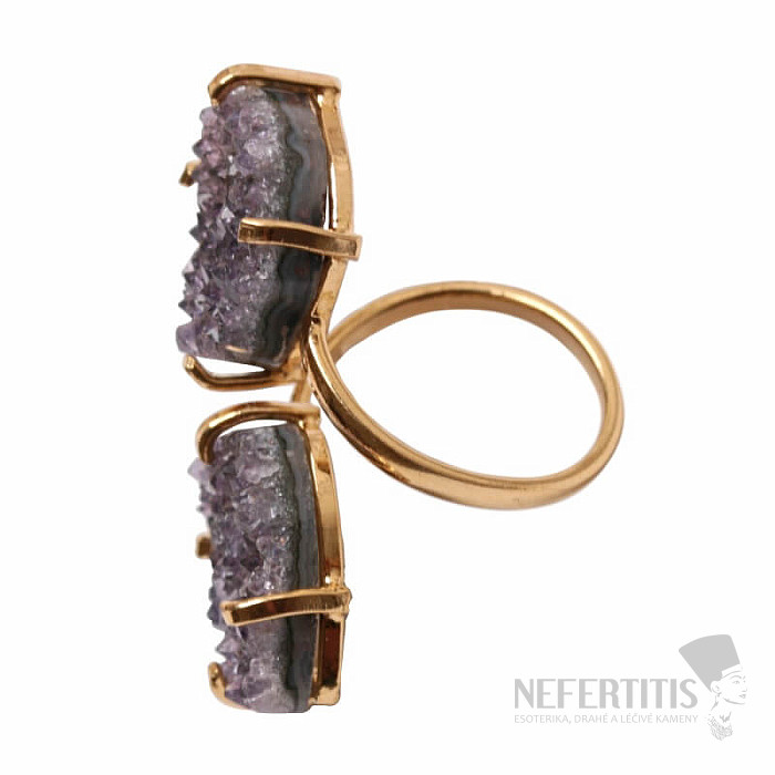 Entdecken Sie den Charme sanfter Eleganz mit diesem vergoldeten Ring, der von zwei Amethyst-Drusen dominiert wird. Jeder Stein ist ein Unikat. Der Ring ist eine Hommage an weibliche Schönheit und Individualität. Amethyst ist ein Stein der Leidenschaft, Liebe und des Verständnisses. Material: Naturstein, vergoldetes Messing. Sie erwerben den abgebildeten Ring.