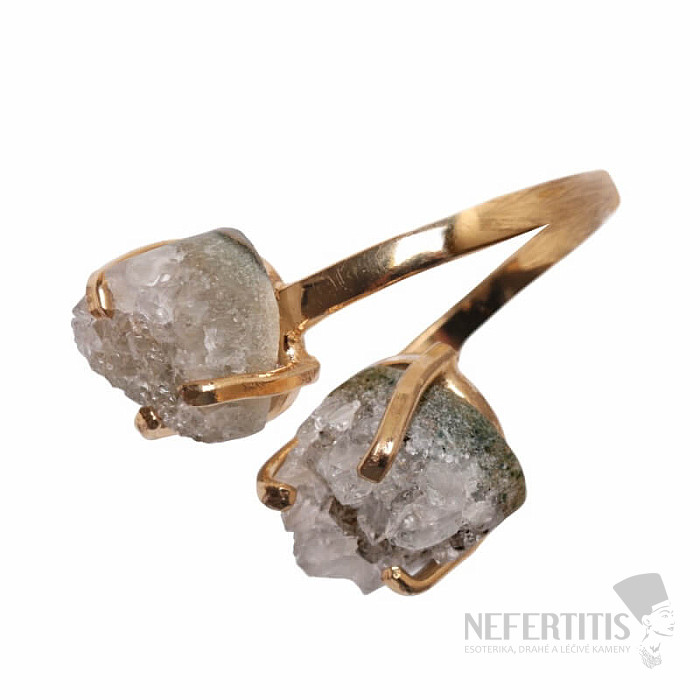 Entdecken Sie den Charme sanfter Eleganz mit diesem vergoldeten Ring, der von zwei Amethyst-Drusen dominiert wird. Jeder Stein ist ein Unikat. Der Ring ist eine Hommage an weibliche Schönheit und Individualität. Amethyst ist ein Stein der Leidenschaft, Liebe und des Verständnisses. Material: Naturstein, vergoldetes Messing. Sie erwerben den abgebildeten Ring.