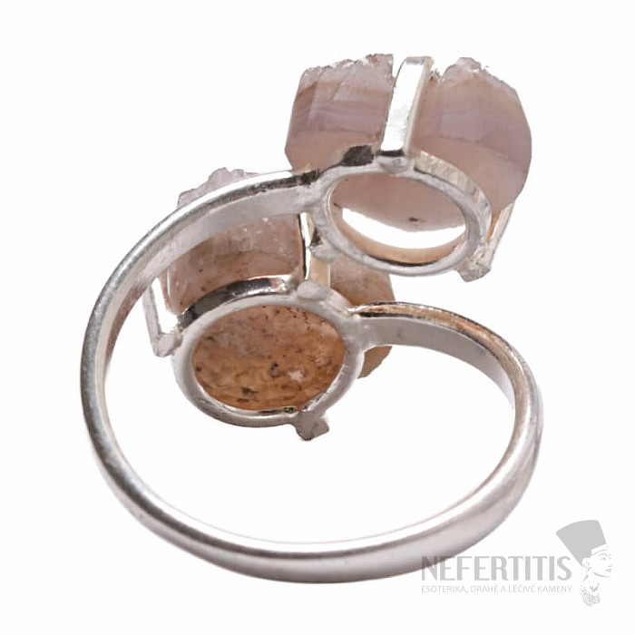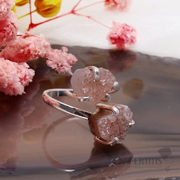 Entdecken Sie den Charme sanfter Eleganz mit diesem versilberten Ring , der von zwei Drusen aus rosa Amethyst dominiert wird. Dieses Mineral wurde erst vor relativ kurzer Zeit in Patagonien, Argentinien, entdeckt. Sein Abbau ist begrenzt, was ihn noch seltener macht. Jeder Stein ist ein Unikat. Der Ring ist eine Hommage an weibliche Schönheit und Individualität. Amethyst ist ein Stein der Leidenschaft, Liebe und des Verständnisses. Material: Naturstein, versilbertes Messing. Sie kaufen den abgebildeten Ring.