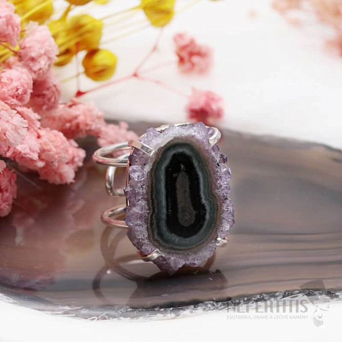 Entdecken Sie den Charme der Eleganz mit diesem versilberten Ring, dessen dominierendes Merkmal der Stalaktitschliff des Amethysts ist. Jeder Stein ist ein Unikat. Amethyst ist ein Stein der Liebe, Leidenschaft und des Verständnisses. Material: Naturstein, versilbertes Messing. Sie kaufen den abgebildeten Ring.