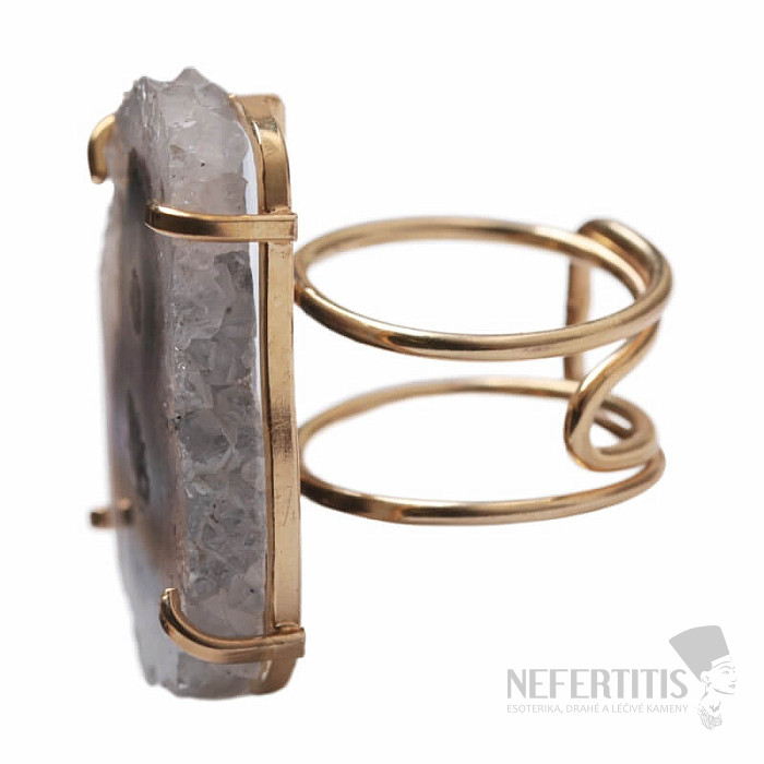 Entdecken Sie den Charme der Eleganz mit diesem vergoldeten Ring, dessen dominierendes Merkmal der Schliff eines Stalaktiten – eines Amethyst-Stalaktiten – ist. Jeder Stein ist ein Unikat. Amethyst ist ein Stein der Liebe, Leidenschaft und des Verständnisses. Material: Naturstein, vergoldetes Messing. Sie kaufen den abgebildeten Ring.