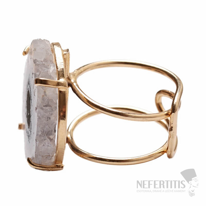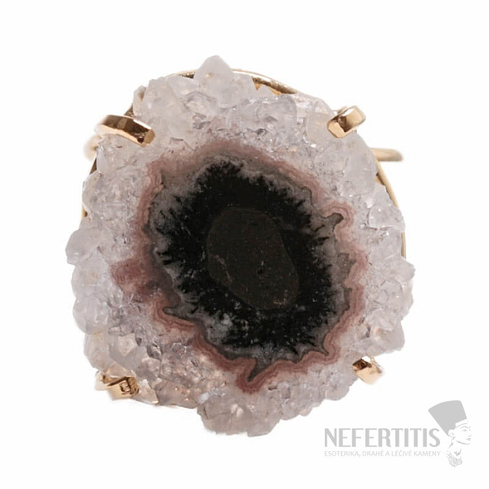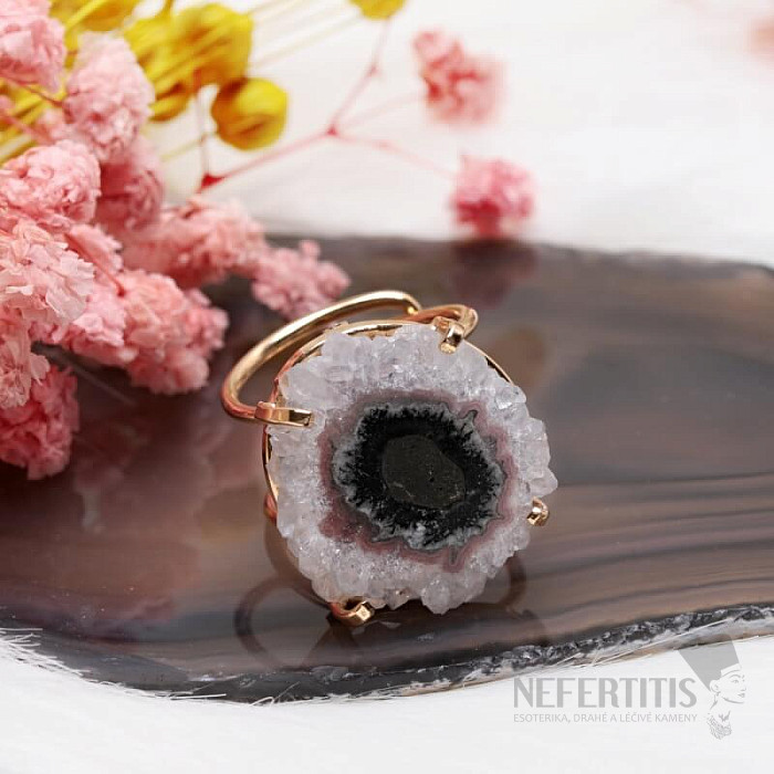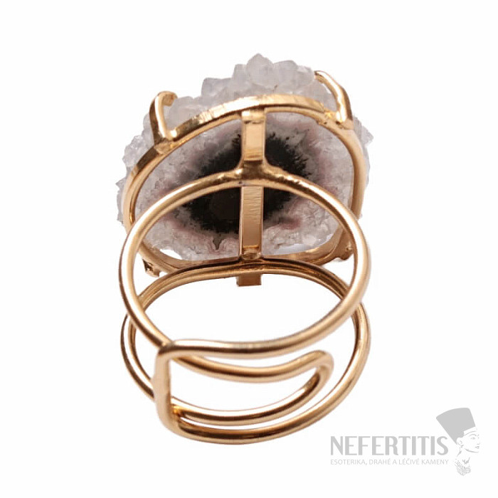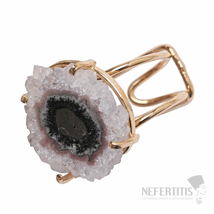 Entdecken Sie den Charme der Eleganz mit diesem vergoldeten Ring, dessen dominierendes Merkmal der Schliff eines Stalaktiten – eines Amethyst-Stalaktiten – ist. Jeder Stein ist ein Unikat. Amethyst ist ein Stein der Liebe, Leidenschaft und des Verständnisses. Material: Naturstein, vergoldetes Messing. Sie kaufen den abgebildeten Ring.