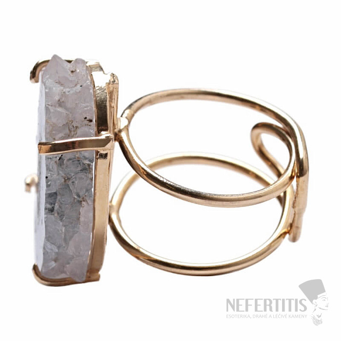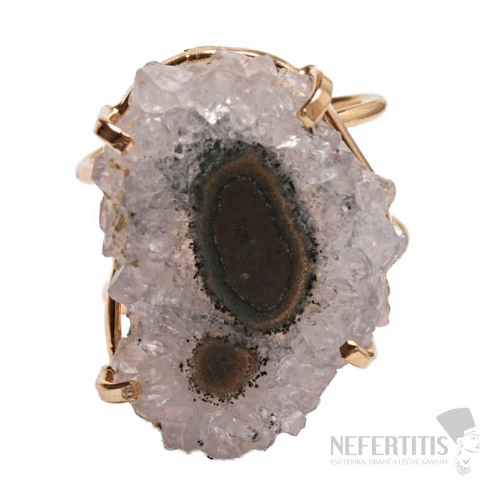 Entdecken Sie den Charme der Eleganz mit diesem vergoldeten Ring, dessen dominierendes Merkmal der Schliff eines Stalaktiten – eines Amethyst-Stalaktiten – ist. Jeder Stein ist ein Unikat. Amethyst ist ein Stein der Liebe, Leidenschaft und des Verständnisses. Material: Naturstein, vergoldetes Messing. Sie kaufen den abgebildeten Ring.