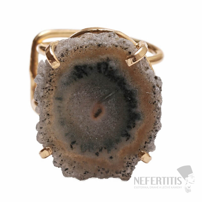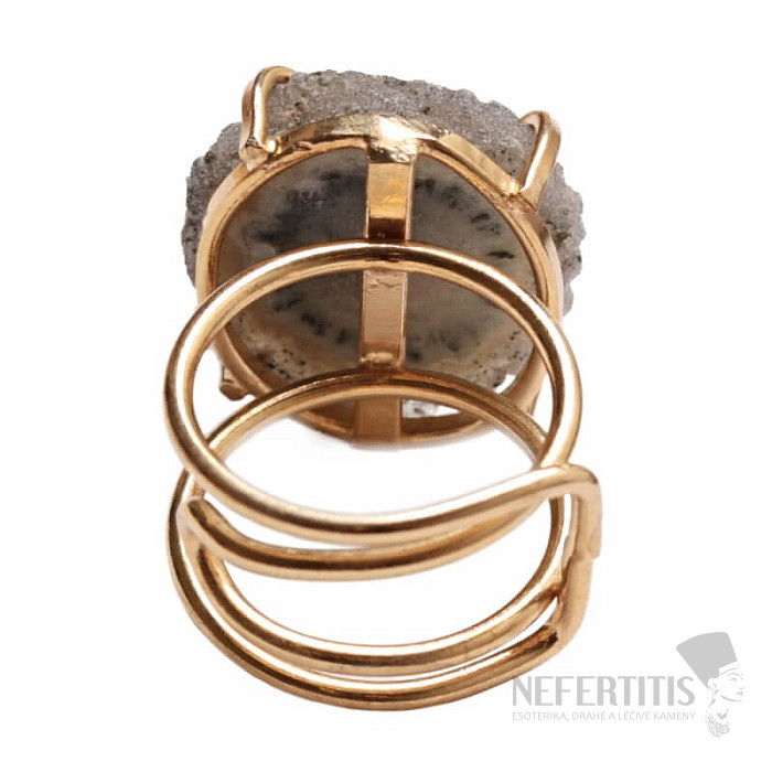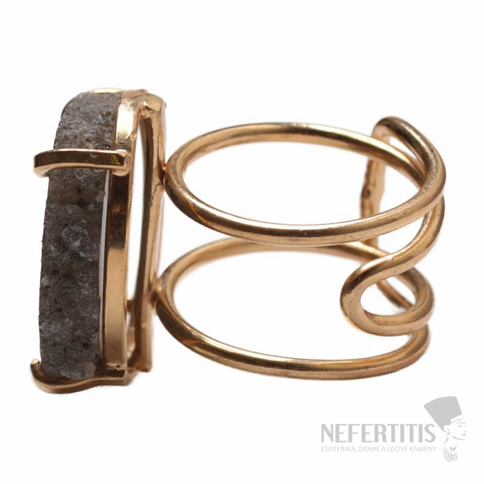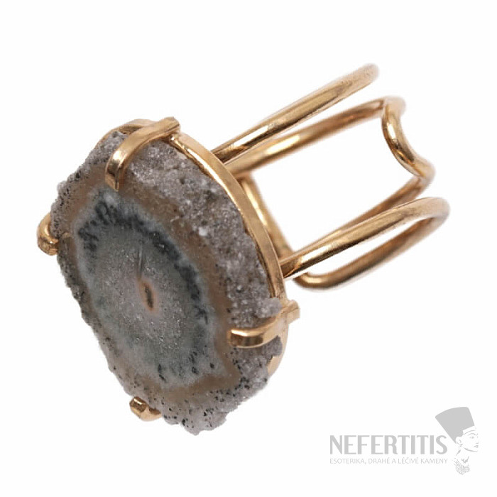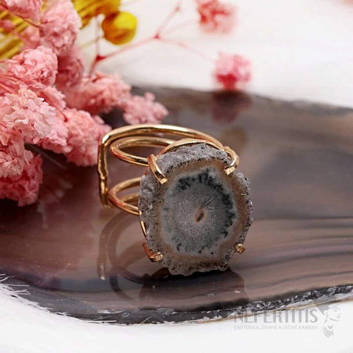 Entdecken Sie den Charme der Eleganz mit diesem vergoldeten Ring, dessen dominierendes Merkmal der Schliff eines Stalaktiten – eines Amethyst-Stalaktiten – ist. Jeder Stein ist ein Unikat. Amethyst ist ein Stein der Liebe, Leidenschaft und des Verständnisses. Material: Naturstein, vergoldetes Messing. Sie kaufen den abgebildeten Ring.