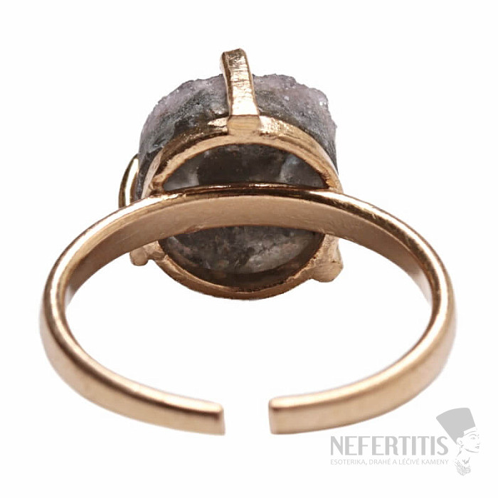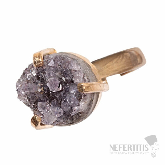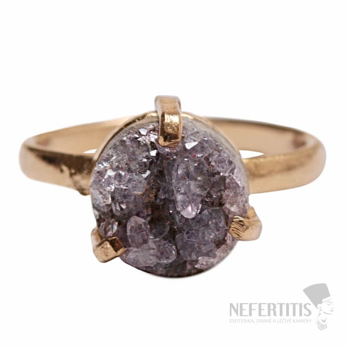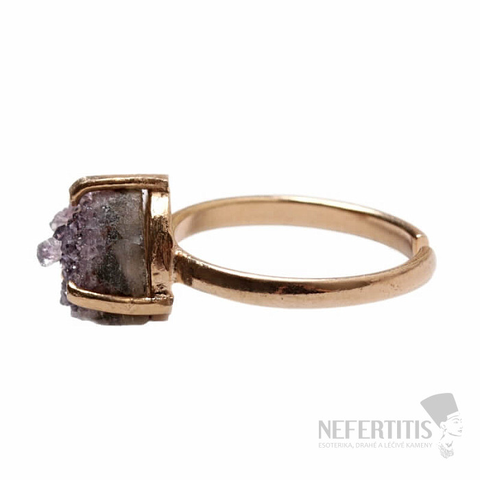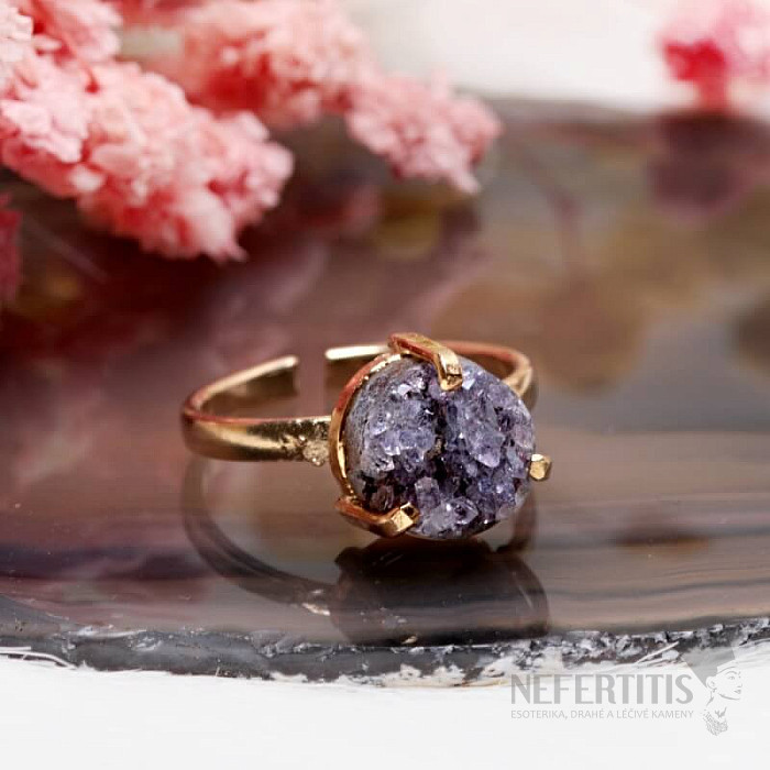 Entdecken Sie den Charme sanfter Eleganz mit diesem vergoldeten Ring, dessen dominierendes Element eine Amethyst -Druse ist . Jeder Stein ist ein Unikat. Der Ring ist eine Hommage an weibliche Schönheit und Individualität. Amethyst ist ein Stein der Leidenschaft, Liebe und des Verständnisses. Material: Naturstein, vergoldetes Messing. Sie erwerben den abgebildeten Ring.