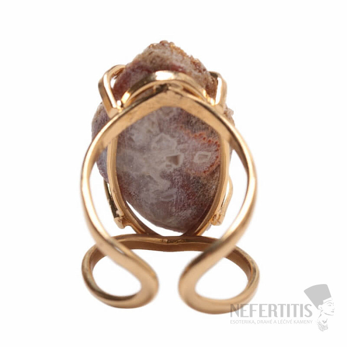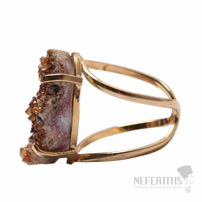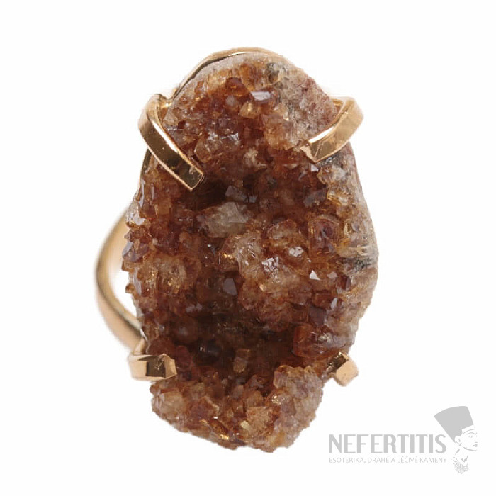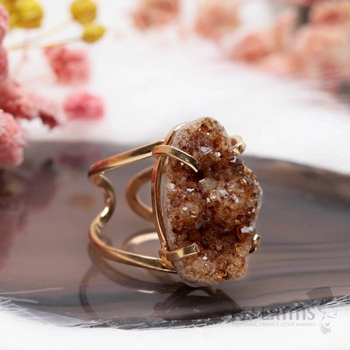 Entdecken Sie die Magie funkelnder Eleganz mit diesem vergoldeten Ring. Dominiert wird er von einer markanten Citrin-Druse aus winzigen Kristallen , die an goldenen Sand oder Sonnenstrahlen erinnern. Jeder Stein ist ein Unikat. Citrin ist ein Stein der Fülle, Freude und persönlichen Stärke. Material: Naturstein, vergoldetes Messing. Sie erwerben den abgebildeten Ring.