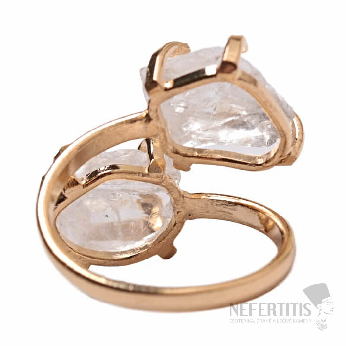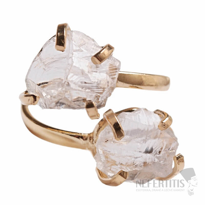 Entdecken Sie den Charme sanfter Eleganz mit diesem vergoldeten Ring, der von zwei Kristallen dominiert wird. Jeder Stein ist ein Unikat. Kristall gilt als universeller Kristall. Seine unregelmäßige Form und natürliche Schönheit machen ihn zu einem einzigartigen Schmuckstück mit Seele. Material: Naturstein, vergoldetes Messing. Sie erwerben den abgebildeten Ring.