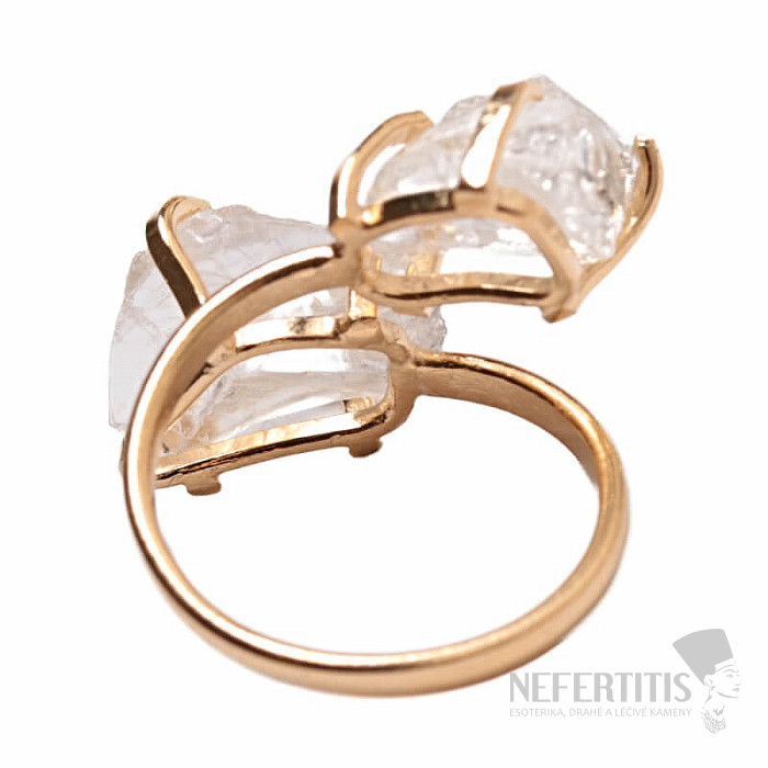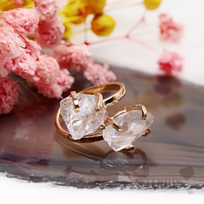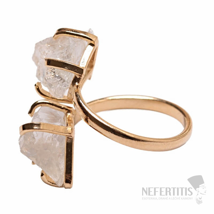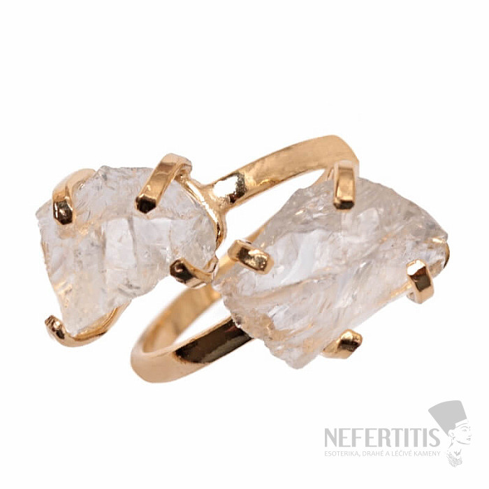 Entdecken Sie den Charme sanfter Eleganz mit diesem vergoldeten Ring, der von zwei Kristallen dominiert wird. Jeder Stein ist ein Unikat. Kristall gilt als universeller Kristall. Seine unregelmäßige Form und natürliche Schönheit machen ihn zu einem einzigartigen Schmuckstück mit Seele. Material: Naturstein, vergoldetes Messing. Sie erwerben den abgebildeten Ring.