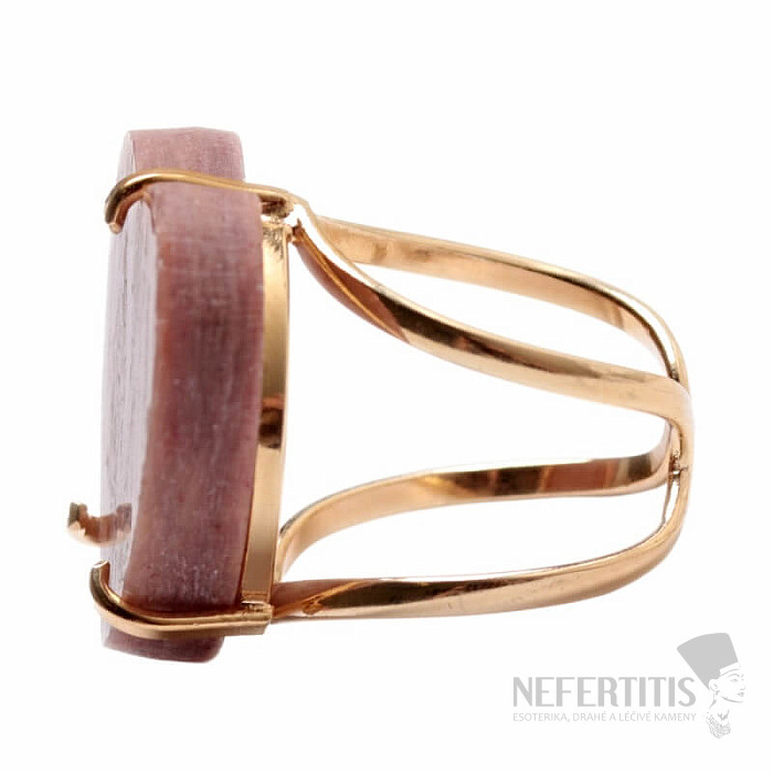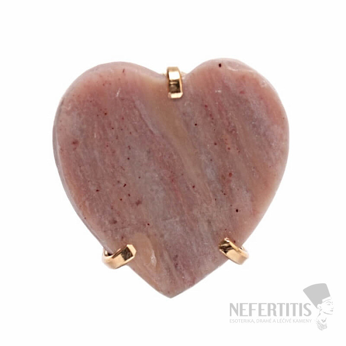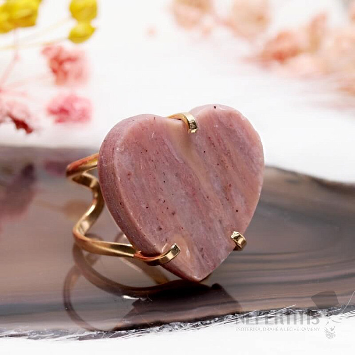 Entdecken Sie den Charme sanfter Eleganz mit diesem vergoldeten Ring, der von einem großen Erdbeerkristall in Herzform dominiert wird. Jeder Stein ist ein Unikat. Er zeichnet sich durch zarte Rosatöne und natürliche Einschlüsse aus. Das Herz symbolisiert Liebe, Freude und Glück, und der Kristall fördert Selbstliebe, Sanftmut, Harmonie und inneren Frieden. Material: Naturstein, vergoldetes Messing. Sie erwerben den abgebildeten Ring.