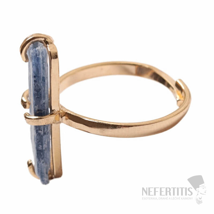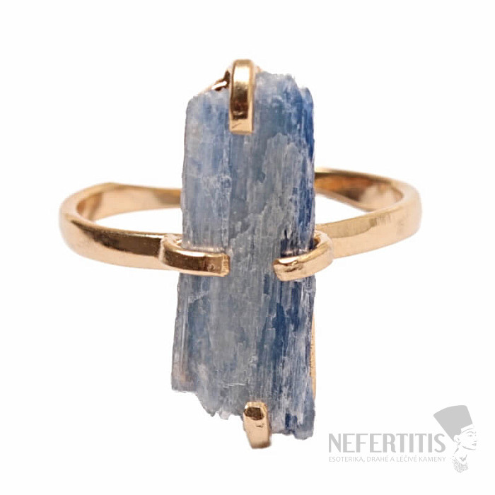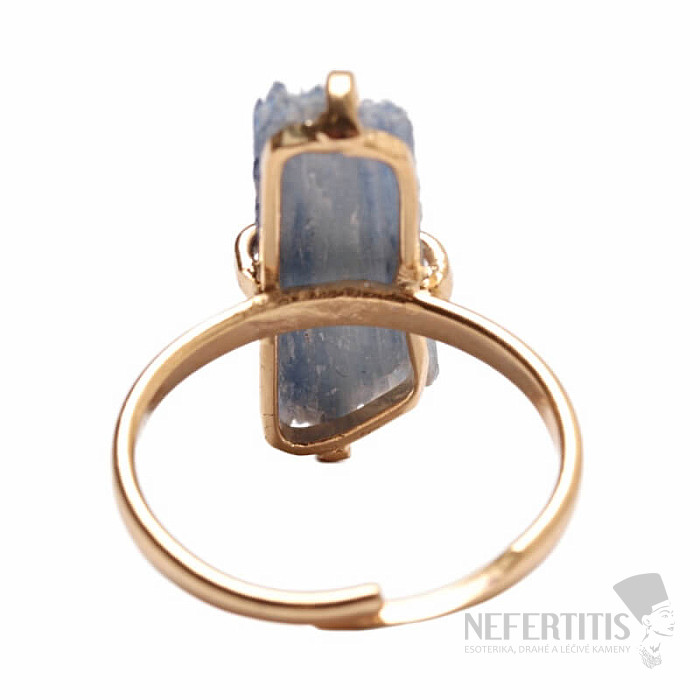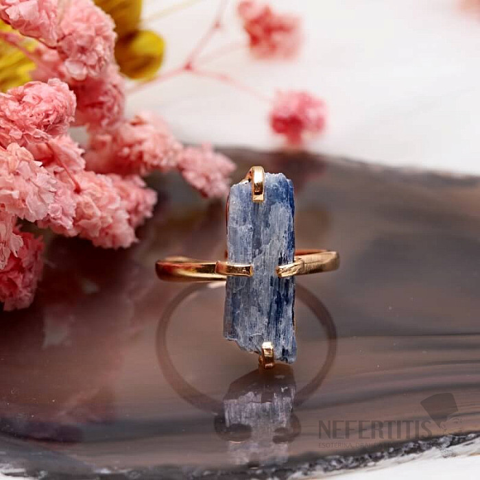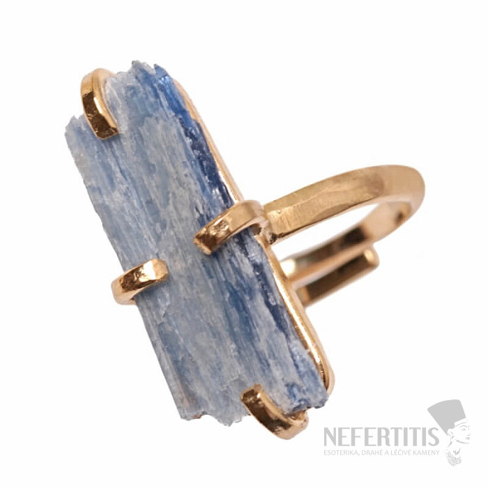 Entdecken Sie den Charme der Eleganz mit diesem vergoldeten Ring, der von rohem blauem Kyanit dominiert wird. Jeder Stein ist ein Unikat. Kyanit ist ein Stein, der die Ruhe tiefen Wassers in sich trägt und als Stein der inneren Ausgeglichenheit, Kommunikation und geistigen Reinheit gilt. Material: Naturstein, versilbertes Messing. Sie kaufen den abgebildeten Ring.