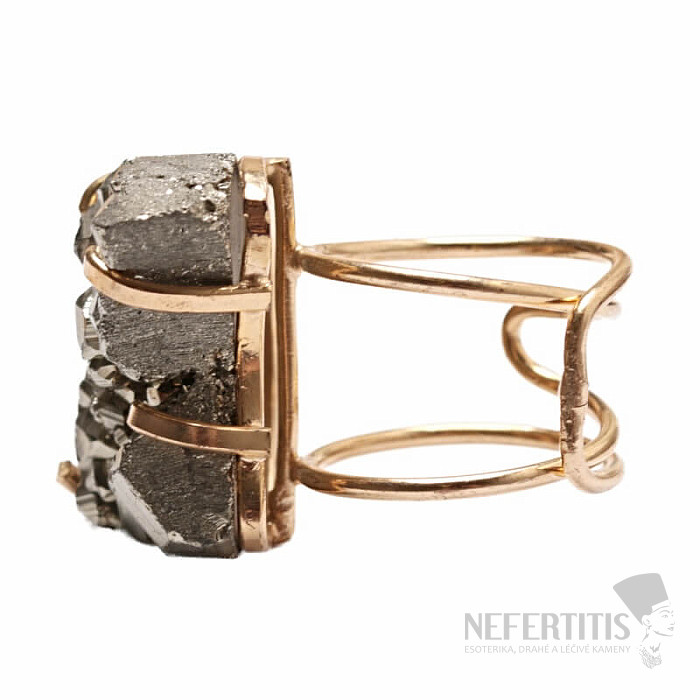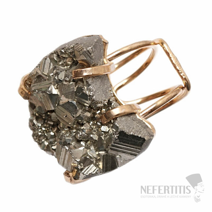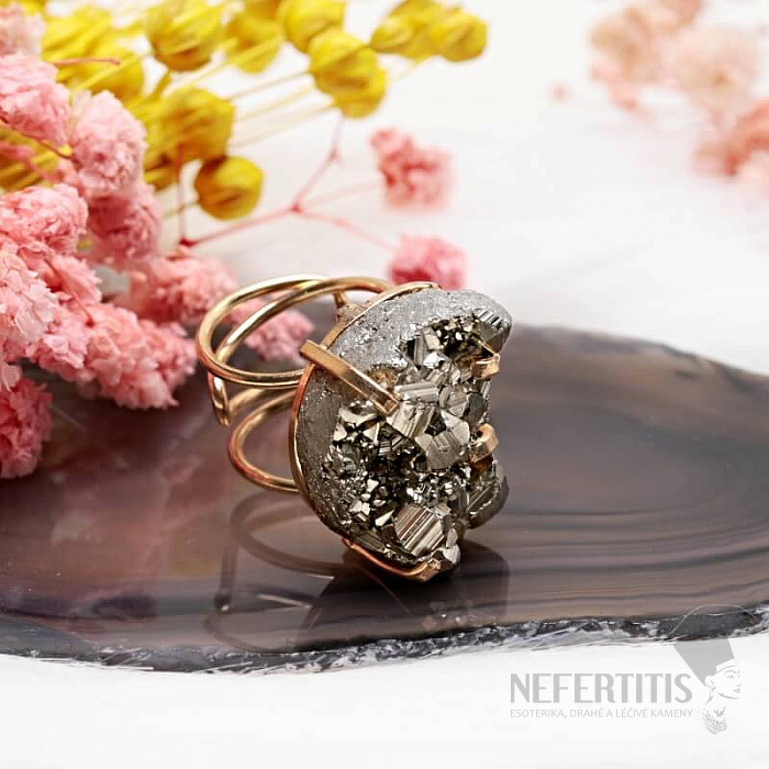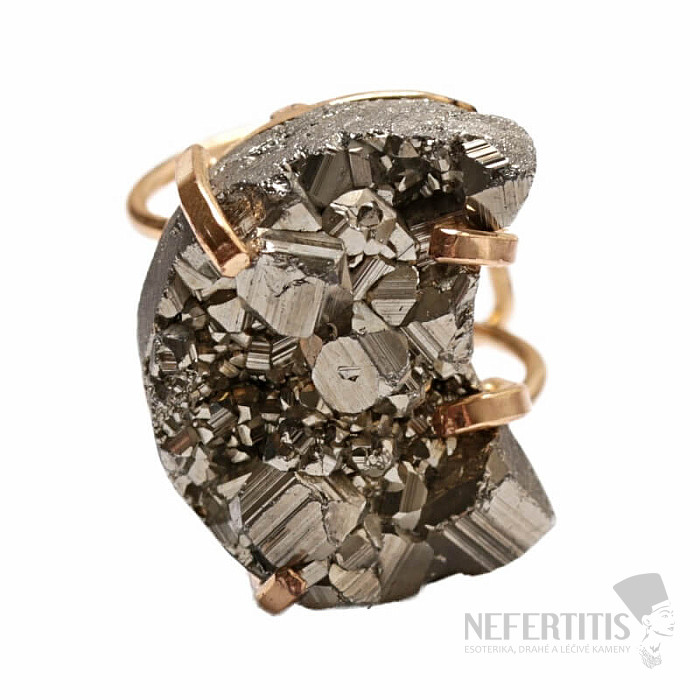 Entdecken Sie den Zauber der Eleganz mit diesem vergoldeten Ring mit schimmernder Pyrit-Druse. Der metallisch-goldene Glanz des Pyrits ähnelt Gold, wirkt aber im Gegensatz zu diesem wild und ungezügelt. Jeder Stein ist ein Unikat. Pyrit ist ein Stein des Schutzes, der Vitalität und des Überflusses . Er fördert innere Stärke, gesundes Selbstvertrauen und Entschlossenheit. Er ist ein Stein der Tatkraft, Stabilität und des Mutes. Material: Naturstein, versilbertes Messing. Sie kaufen den abgebildeten Schmuck direkt.