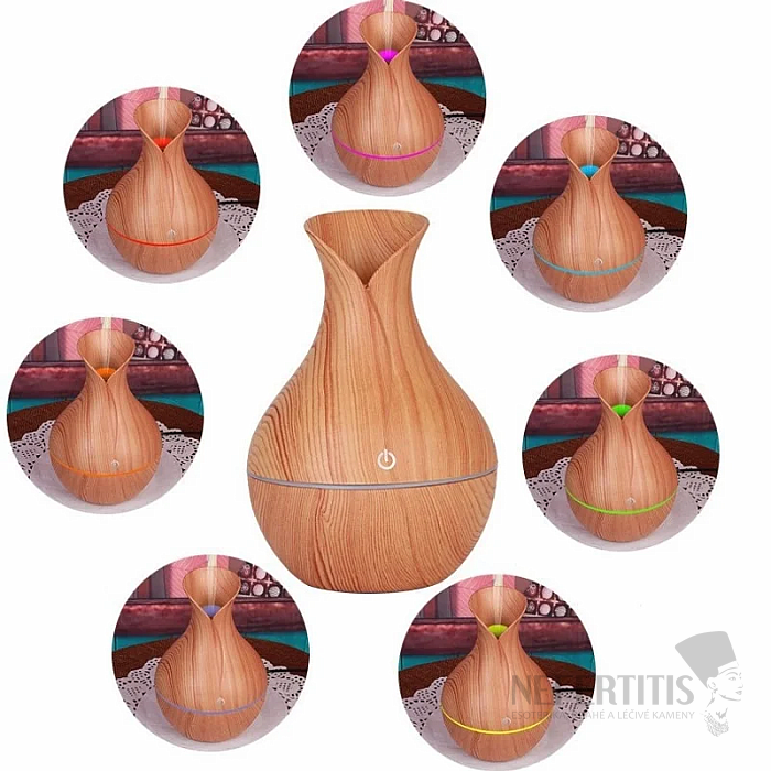 Die Form des Diffusors ähnelt einer eleganten Vase und sein helles Holzdekor verleiht dem Innenraum Wärme und Harmonie. Die farbige LED-Hintergrundbeleuchtung beleuchtet das Gehäuse des Geräts sanft und sorgt für angenehme Lichteffekte zum Entspannen und Schlafen.