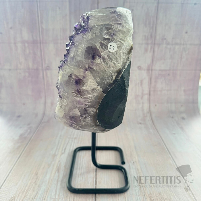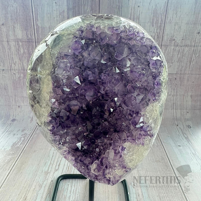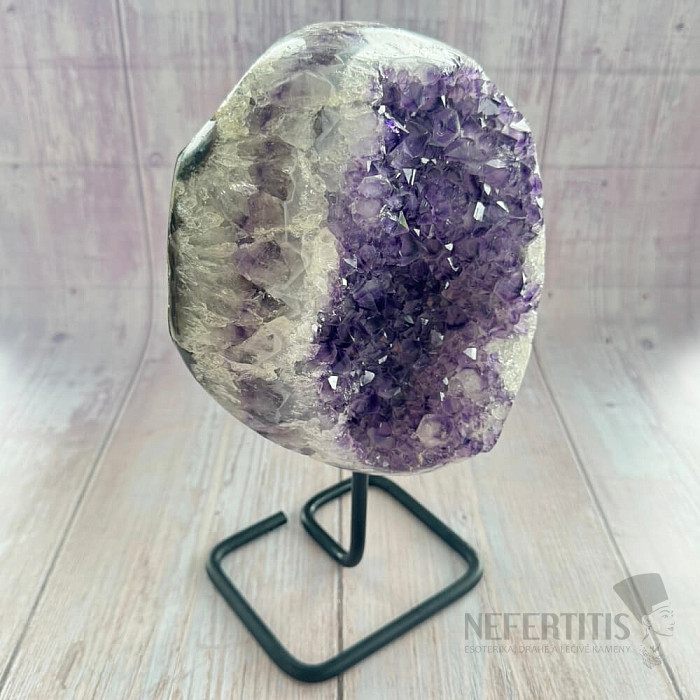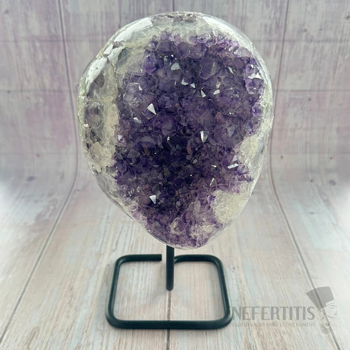 Amethyst-Druse der Qualität A auf einem Metallständer.